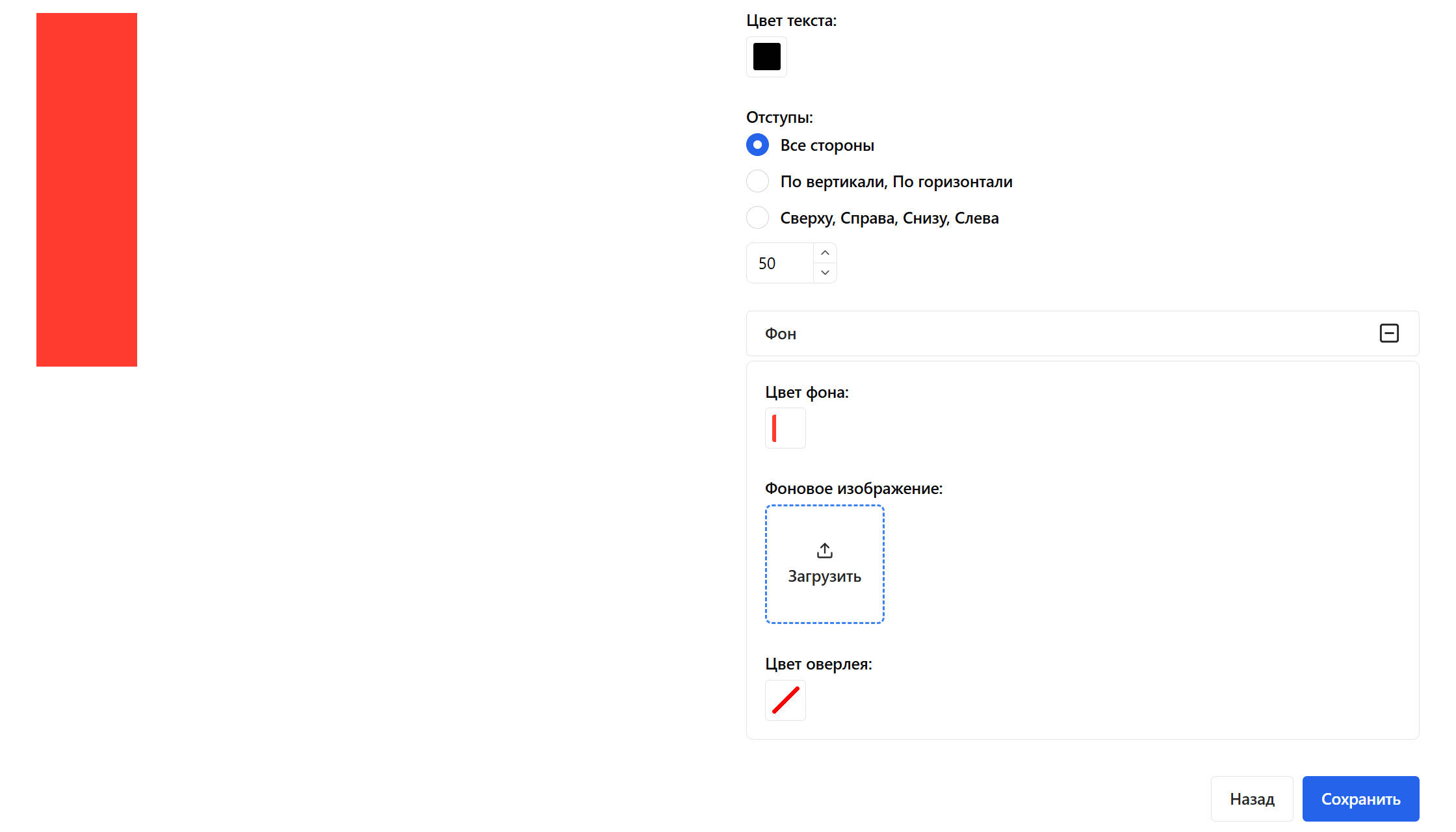 Отступы: сверху — 0, справа — 50, снизу — 50, слева — 230 пикселей.