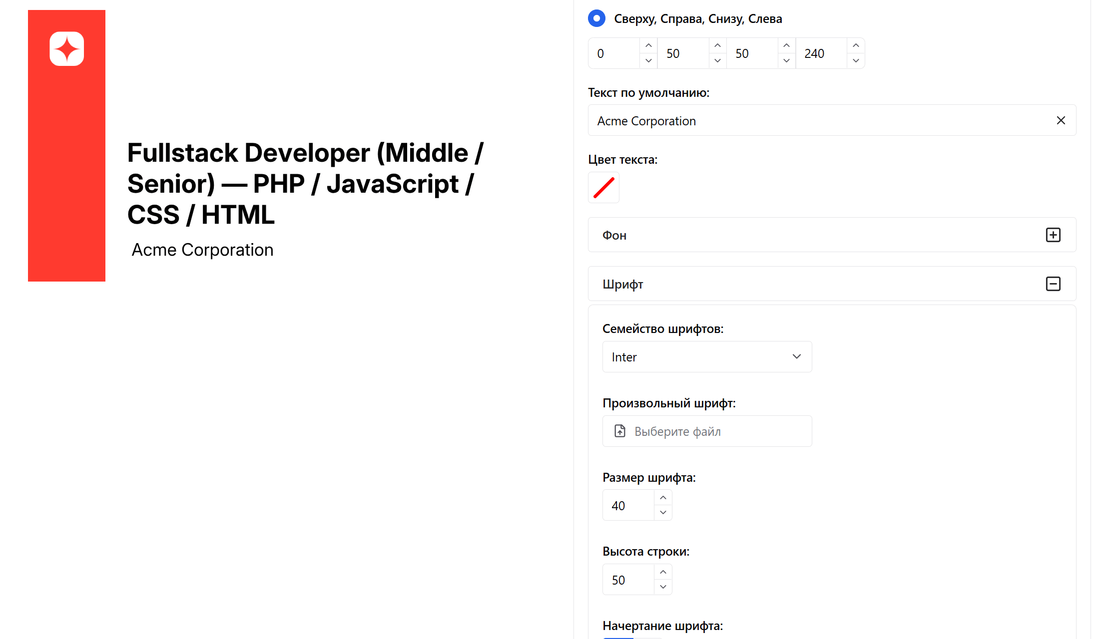 Шрифт — Inter, размер — 40 пикселей, высота строки — 50, ограничение — 1 строка.